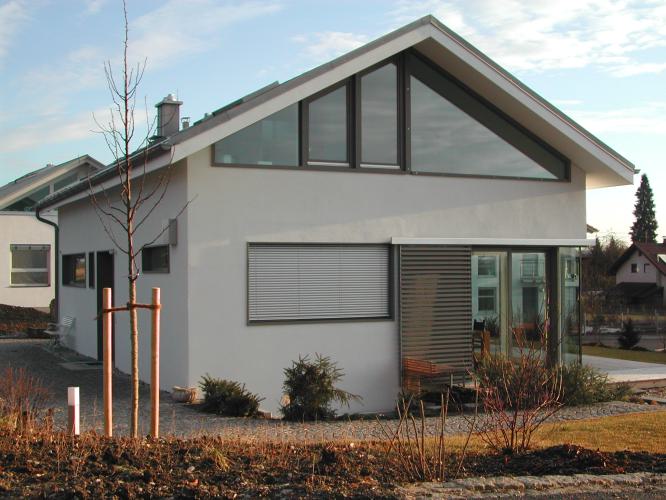 Der Neubau als Niedrigenergiehaus mit moderner Gasbrenner- Heiztechnik und einem Jahresprimärenergiebedarf von unter 100 KWh/m² sollte als konventionelles Massivhaus unter Verwendung besonders hochwertiger Wärmedämmziegel besonders energetisch und damit zeitgemäß umgesetzt werden. Das Wohnhaus sollte mit bewusst reduzierter Formensprache als schlichter Baukörper mit weiß verputzter Fassade, Satteldach mit Edelstahl- Blecheindeckung, grauen Holzfenster und Schiebeläden ausgeführt und ein repräsentatives, modernes Erscheinungsbild erhalten.